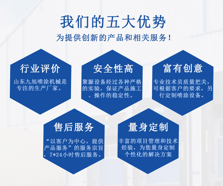 目前山東九旭機械設備已領跑中國液壓聚脲設備行業,價格合理成為廣大客戶之首選。液壓聚脲噴涂機廠家所銷售產品主要來自國內及國際知名品牌,產品性能優良,價格合理,專業的技術和完善的售后服務贏得國內外眾多客戶的誠摯贊賞........